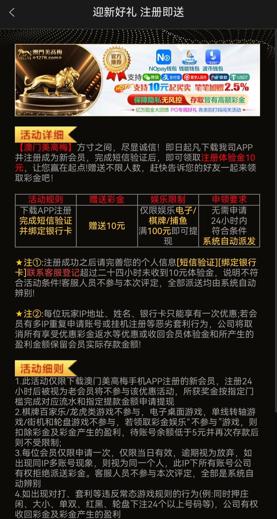 注册送10我没打出来100起提,先下载然后注册绑定银行卡跟验证手机号。找在线客服报ID跟手机号登记马上送。活动写的是自动送。