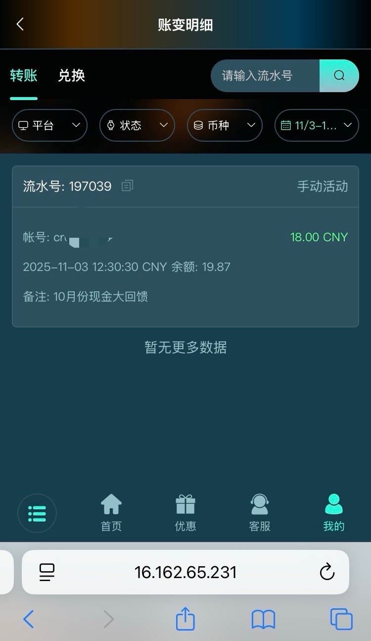 幻影收到10月份现金回馈彩金,有号的去看看。