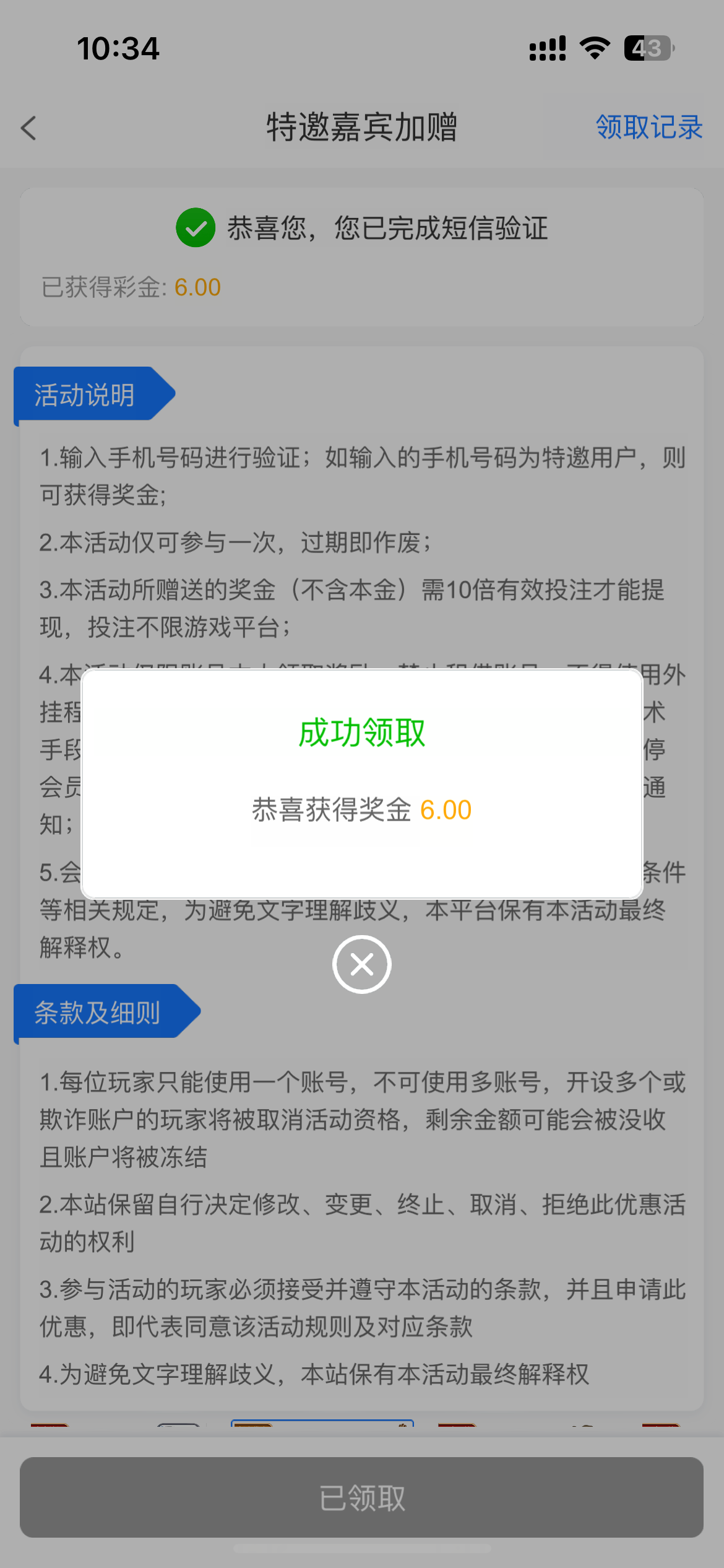 碰瓷特邀彩金6块 有号的可以上去看看 没有号的先注册 不要充值