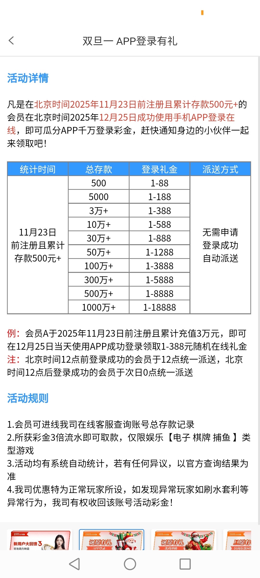 【银河优越会】圣诞登录彩金送1一388