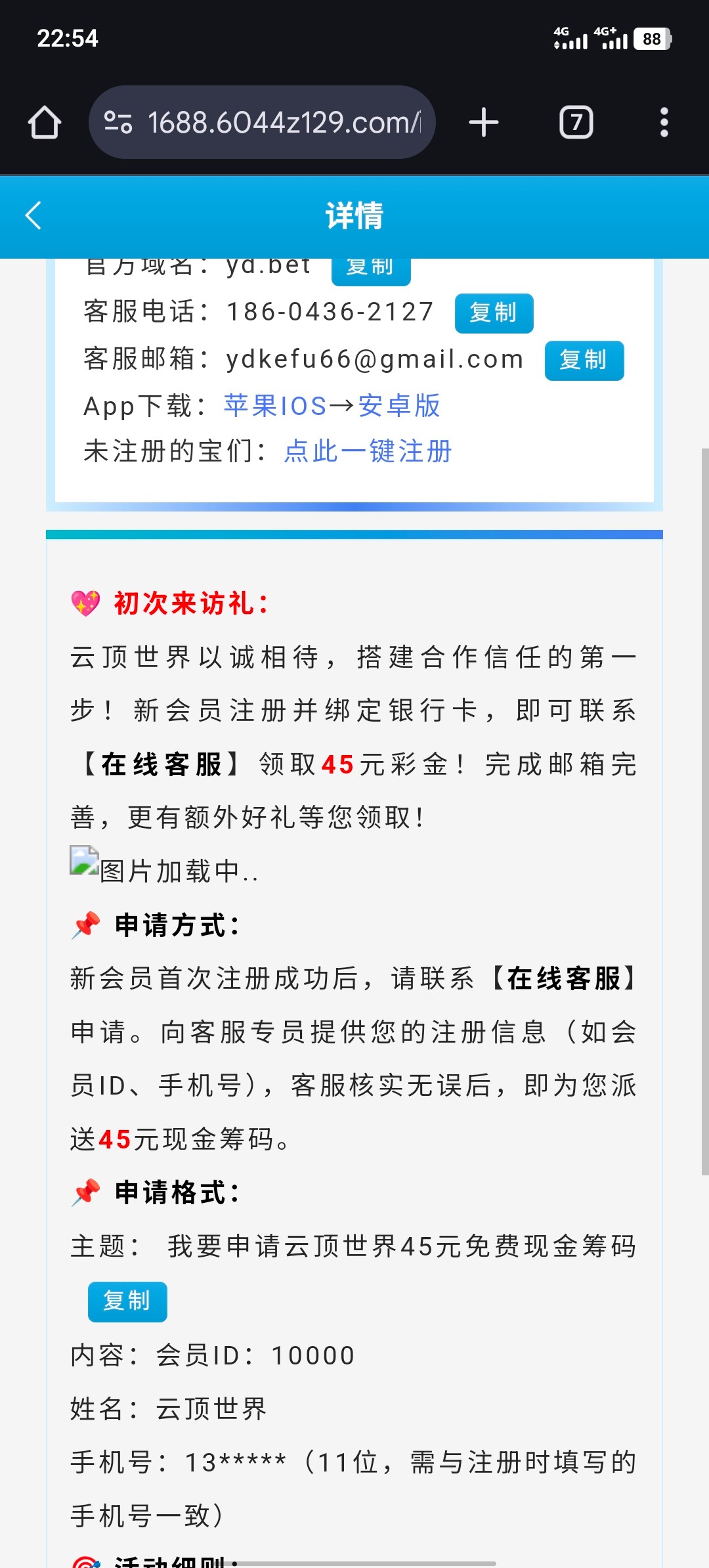 注册账号 完善信息 找客服自助申请 45元彩金